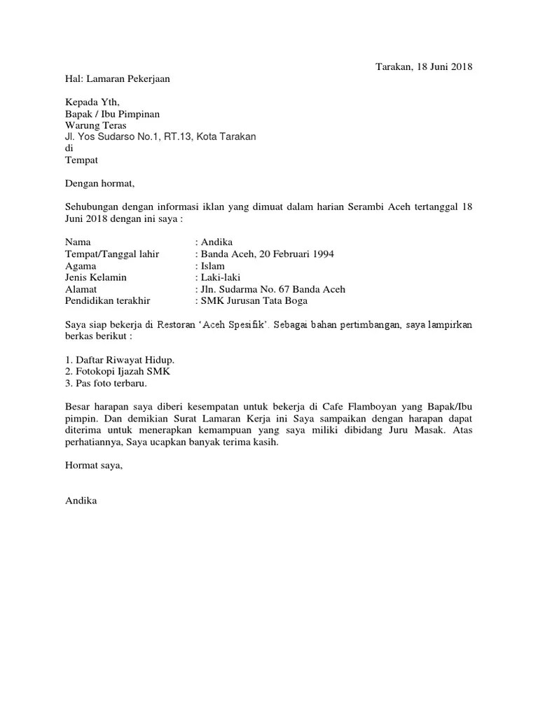 Contoh surat lamaran pekerjaan dalam bahasa inggris di restoran. 25+ contoh cv lamaran kerja (daftar riwayat hidup) yang. 49+ contoh surat lamaran kerja di restoran sebagai waiters. Saya doakan agar mendapatkan posisi yang tepat sesuai kemampuanmu. Contoh surat lamaran kerja adalah suatu hal yang sangat dibutuhkan oleh para orang yang sedang .