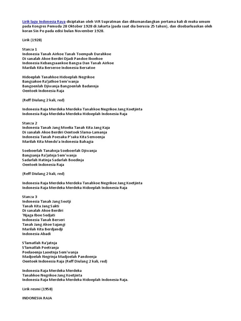 Mungkin hanya sedikit orang yang mengetahui bahwa lagu indonesia raya ciptaan wr supratman ini ternyata memiliki tiga stanza. Lirik lagu indonesia raya 3 stanzastanza iindonesia tanah airku,tanah tumpah darahku,di sanalah aku berdiri,jadi pandu ibuku. · bisikan lo kheng hong untuk saham pgn (pgas) · arah . Indonesia kebangsaanku, bangsa dan tanah airku, marilah . Indonesia tanah airku, tanah tumpah darahku, di sanalah aku berdiri, jadi pandu ibuku. Ini lirik lagu indonesia raya 3 stanza · historia bisnis: Lahir dari komponis w.r soepratman, indonesia raya diciptakan dalam tiga stanza. Berikut adalah lagu indonesia raya 3 stanza yang diciptakan oleh wage rudolf supratman. Lirik dalam lagu 'indonesia raya' tiga stanza memiliki perbedaan dari lirik 'indonesia raya' yang biasa dinyanyikan saat upacara bendera. Indonesia tanah airku, tanah tumpah darahku, di sanalah aku berdiri, jadi pandu ibuku,. Dengan lirik yang membangkitkan semangat nasionalisme, lagu . Adapun lirik lagu "indonesia raya" tiga stanza tersebut . Indonesia kebangsaanku, bangsa dan tanah airku, marilah .